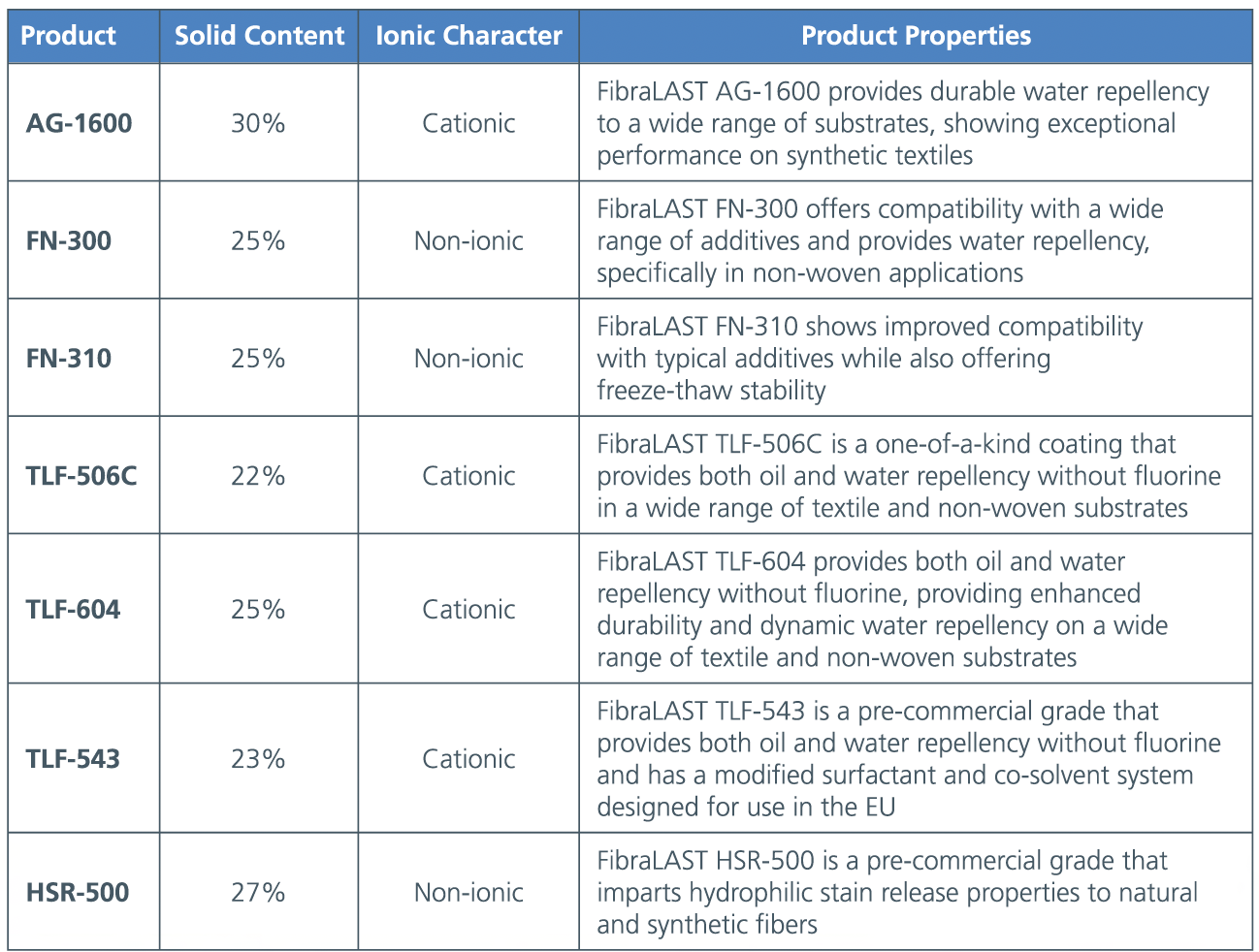 FibraLAST coatings are the industry’s first non-fluorinated coatings designed to deliver exceptional oil and water repellency for both woven and nonwoven industrial fabrics and technical textiles. They are formulated from plant-derived components and contain no silicones or heavy metals.
