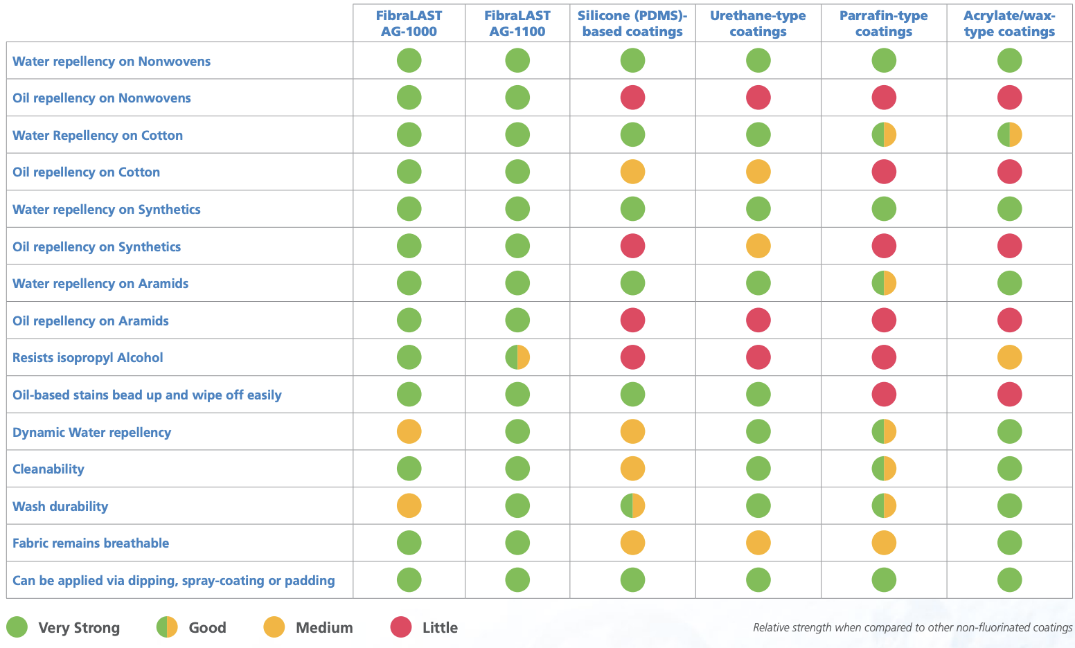Many non-fluorinated coatings can provide some level of water or stain repellency for textiles. However, only FibraLAST polymeric coatings consistently deliver effective repellency against both oil and water on woven and nonwoven fabrics.